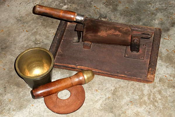 This photo, taken by Esther, shows the bronze pestle and mortar set and the cutter knife used by YowCH’s parents for the herbs business.
